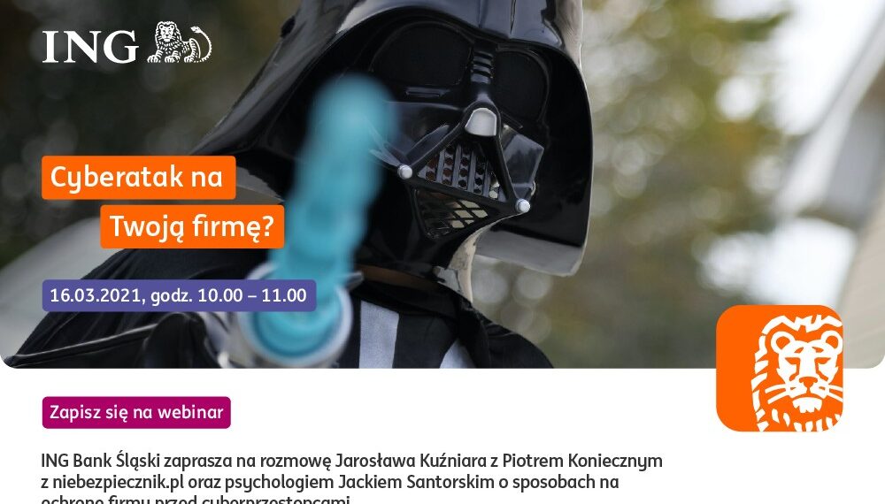 ING Bank Śląski zaprasza na webinar pt. „Cyberatak na Twoją firmę?”. Podczas spotkania eksperci opowiedzą o sposobach na ochronę firmy przed cyberprzestępcami. Rozmowę z Piotrem Koniecznym z niebezpiecznik.pl oraz z psychologiem Jackiem Santorskim poprowadzi Jarosław Kuźniar.